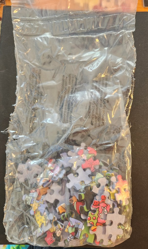 Since I commented on the size of the plastic bag yesterday, I thought I’d include a picture this time. I’m not sure if there are requirements that mean the bag has to be about double the size needed, but this seems excessive. On the plus side, though, there is very little in the way of puzzle dust.