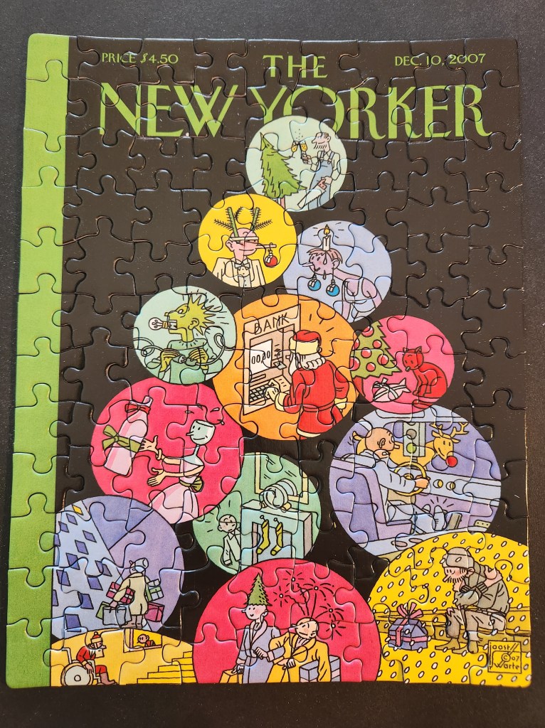 Today’s puzzle was “Xmas Stories” by Joost Swarte. I liked the quirkiness of this cover and the different stories it did try to tell. Some of them are perhaps a little nonsensical, especially on the surface, but there’s some room for interpretation and storytelling.