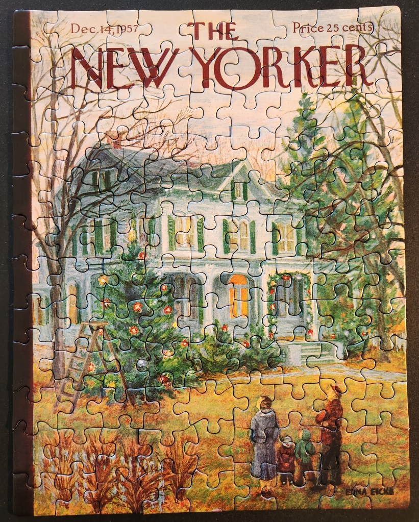 This one might be my favorite of the whole set. When I finished it, I immediately went online to see if there was a larger version of it. I really like the classic Christmas quality of it. It’s not about a party or the hustle and bustle of the season. It’s just a family decorating their house for Christmas. To me, that’s something fairly relatable. You can tell that it’s just been done because the ladder is still out. I recognize the artist’s name, Edna Eicke, from some of the other images in this set. So, I might have to go look some at her works. Perhaps there are some other images of hers that I like and can find as puzzles.