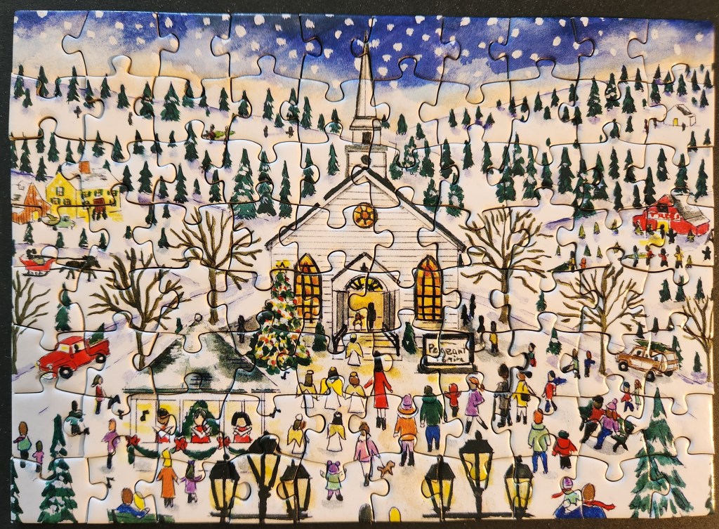 This was a fairly simple puzzle to put together. I’d thought that the collection was going to trend more towards Christmas in notable places, but it seems to be more of the typical Christmas scenes. This one is cute. There are a few buildings around, but the focus is the church. I like that you can see the kids dressed as angels walking in. I don’t see anyone else dressed, so perhaps they’re already in, or it’s just angels. It’s quite the busy scene. Down on the bottom are some carolers and there’s a couple of people in cars to get trees. It is quite a bit like the others, which I suppose is a bit disappointing. I haven’t looked much at the other images for the rest of the collection, so I’ll be interested to see if this trend continues on the other half of the puzzles.