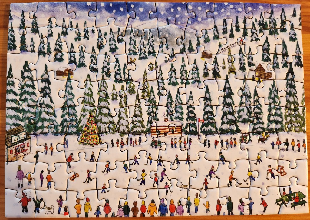 It wasn’t until I saw the writing on the tent that I realized this was supposed to be France. I thought it was another Germany image given the architecture. I liked the colors in this one. The components of the images by now are quite familiar, but this one seemed brighter. I think it’s the Christmas tree and the dark blue night sky. As with yesterday’s I’d love to do a puzzle of just the buildings there. I doubt they’re really arranged quite like that, but even doing a puzzle of the church would be really fun.